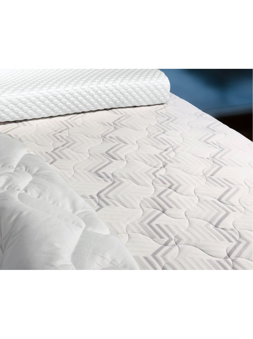 1. Съемный трикотажный  чехол Чехол выполнен из прочной трикотажной ткани, в составе которой не менее 40% натурального хлопка. Ткань простегана по технологии глубокой стежки. Особая техника стёжки позволяет равномерно, без потери формы и объёма, зафиксировать все составляющие чехла. Хлопковые нити в составе ткани обеспечивают здоровый микроклимат во время сна. Чехол имеет разъемную молнию, что позволяет стирать его в домашних условиях.