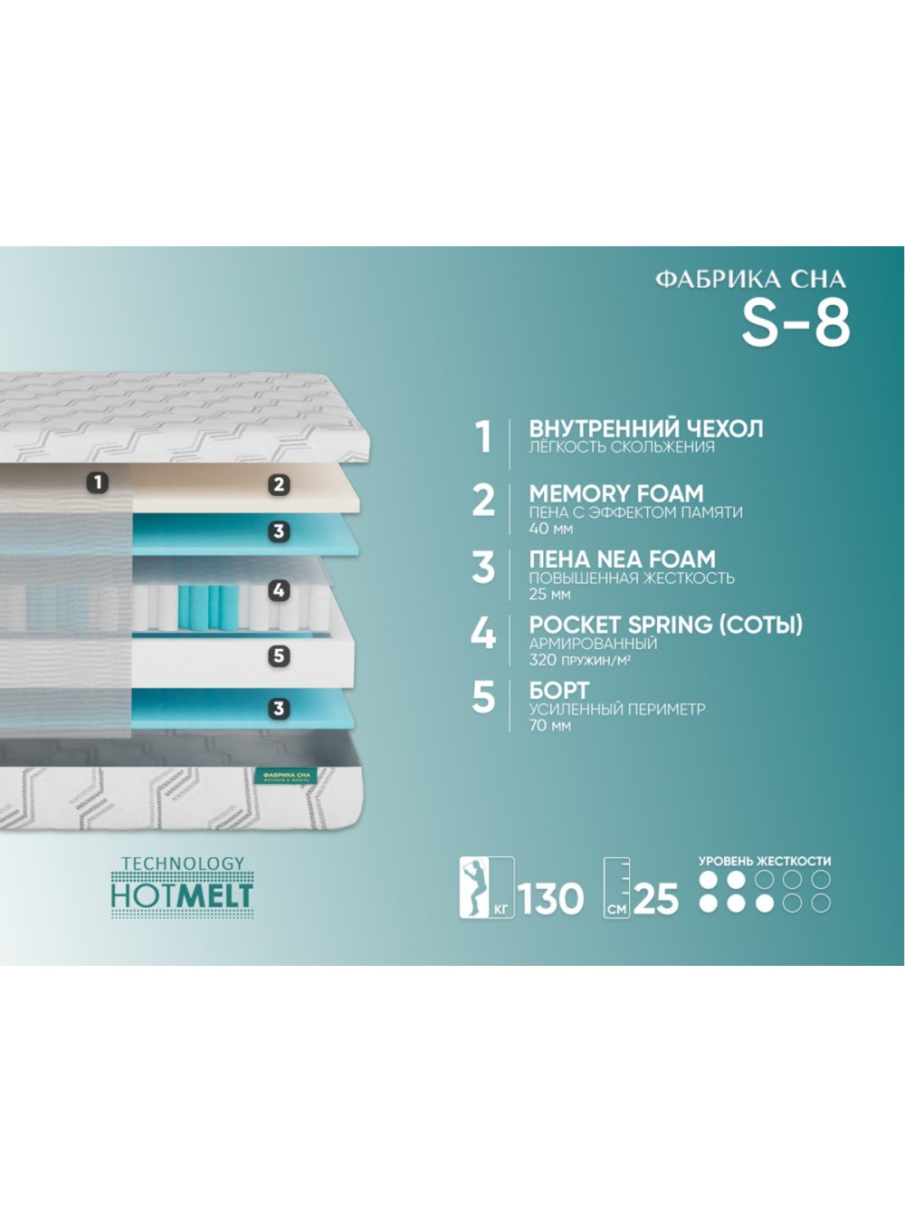 Ортопедический матрас Фабрика сна S-8  - отличный матраc для уверенных и энергичных людей. 7-ми зональный пружинный блок Pocket Spring. шахматной сборки, точечно поддерживает позвоночник в правильном положении, а зоны жесткости регулируют уровень давления на матрас, позволяя отлично высыпаться ночью. Сочетание анатомической пены Nea Foam и пены с эффектом памяти Memorix дополнительно поддерживают спину, способствуя скорейшему восстановлению сил, а слой войлока и упругой пены Nea Foam улучшают анатомические свойства матраса.